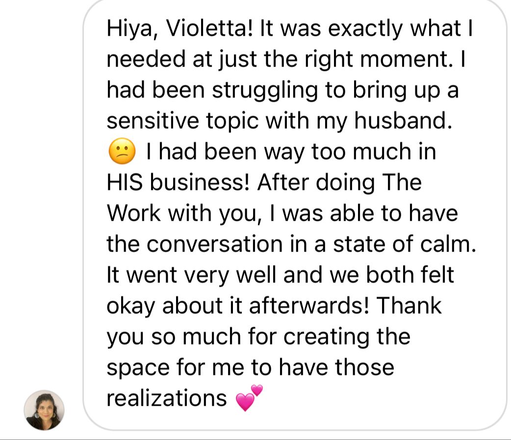 "Simple and powerful! I now understand how my thoughts dictate how I interpret my interaction with a family member I've been having a lot of conflict with. My communication really started to shift after this session and I notice myself being more empathic, patient and less controlling of how I think this family member should be. Violetta is amazing at facilitating this work and asked the right questions to tease out the reasons of hidden guilt and self-judgment in me. I felt safe to express my thoughts without fear of judgment."